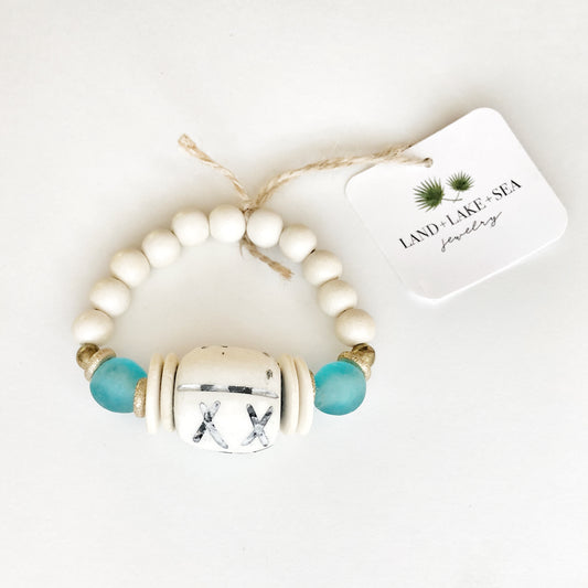 Carved Bone Bead Bracelet with Light Aqua Recycled Glass and Coconut