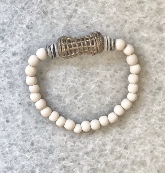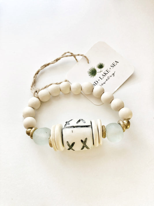 Rustic White African Recycled Glass and Bone Stack Bracelets -