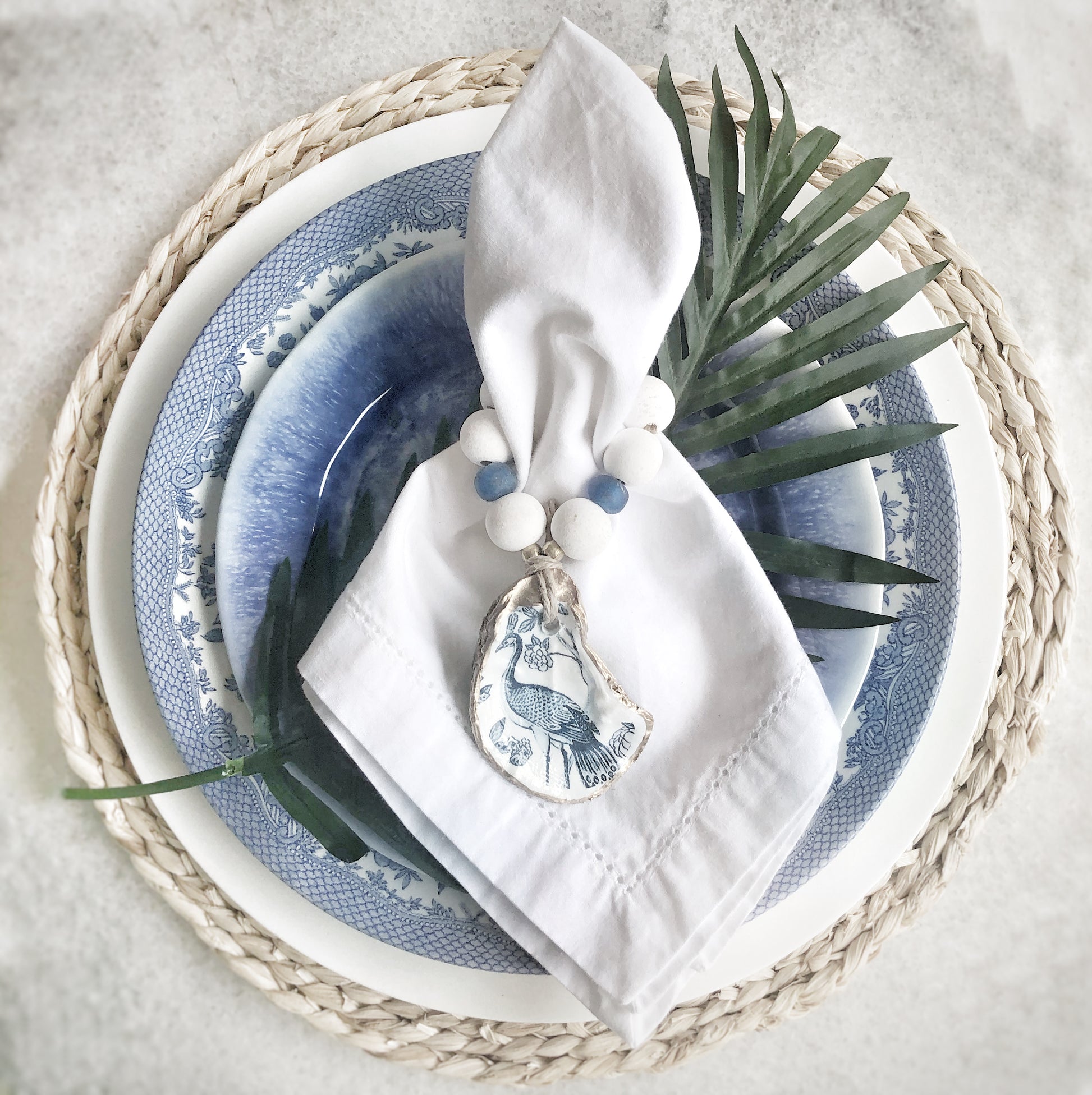 Oyster napkin rings provide a perfect coastal vibe for your dining table. Pair with your favorite dinner napkin, a placemat or charger, dinner plate, salad plate and even a bit of greenery to finish the look.