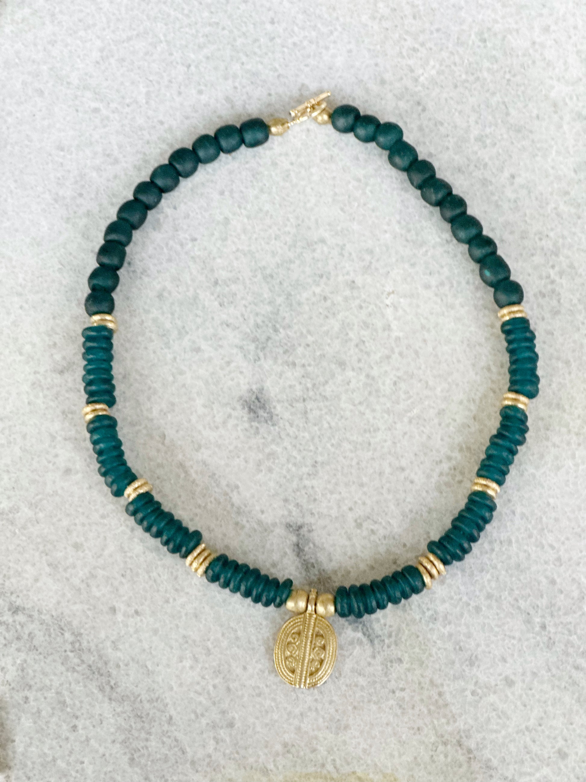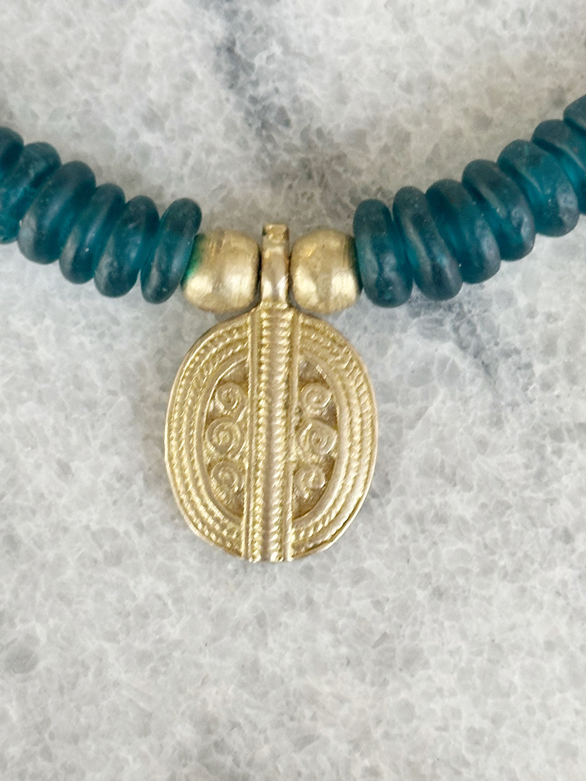 This beautiful necklace features a small brass pendant paired with striking recycled glass beads in an alpine teal hue. The vibrant color comes to life when held up to the light, revealing its rich, captivating depth. Some refer to these beautiful beads as sea glass due to their rustic translucent appearance and coastal hue - though they are not actual sea glass.