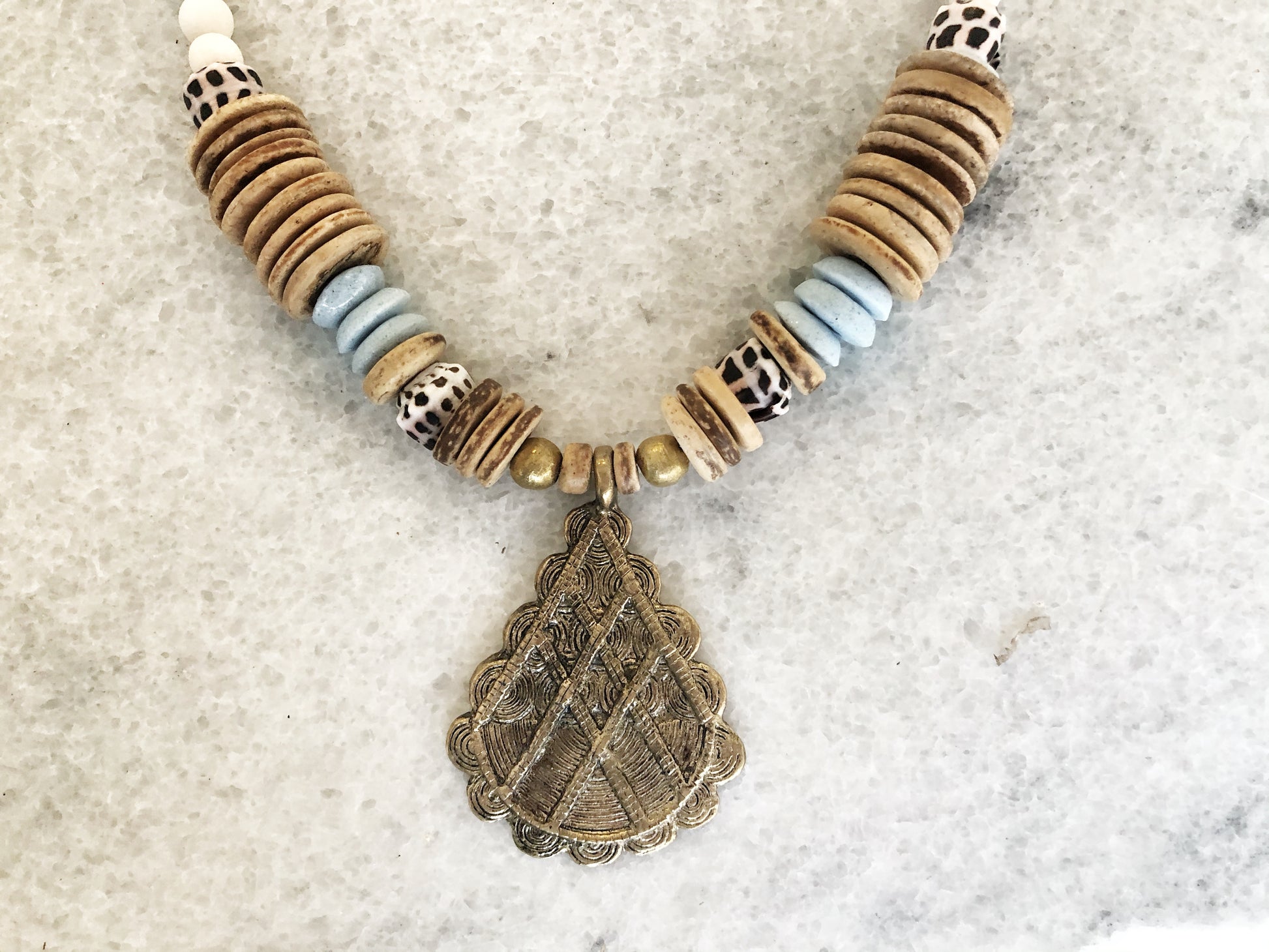 Necklace is made with puka shells, African brass, recycled clear and light blue African glass, coconut and a hand-cast brass pendant on a wood bead strand.
