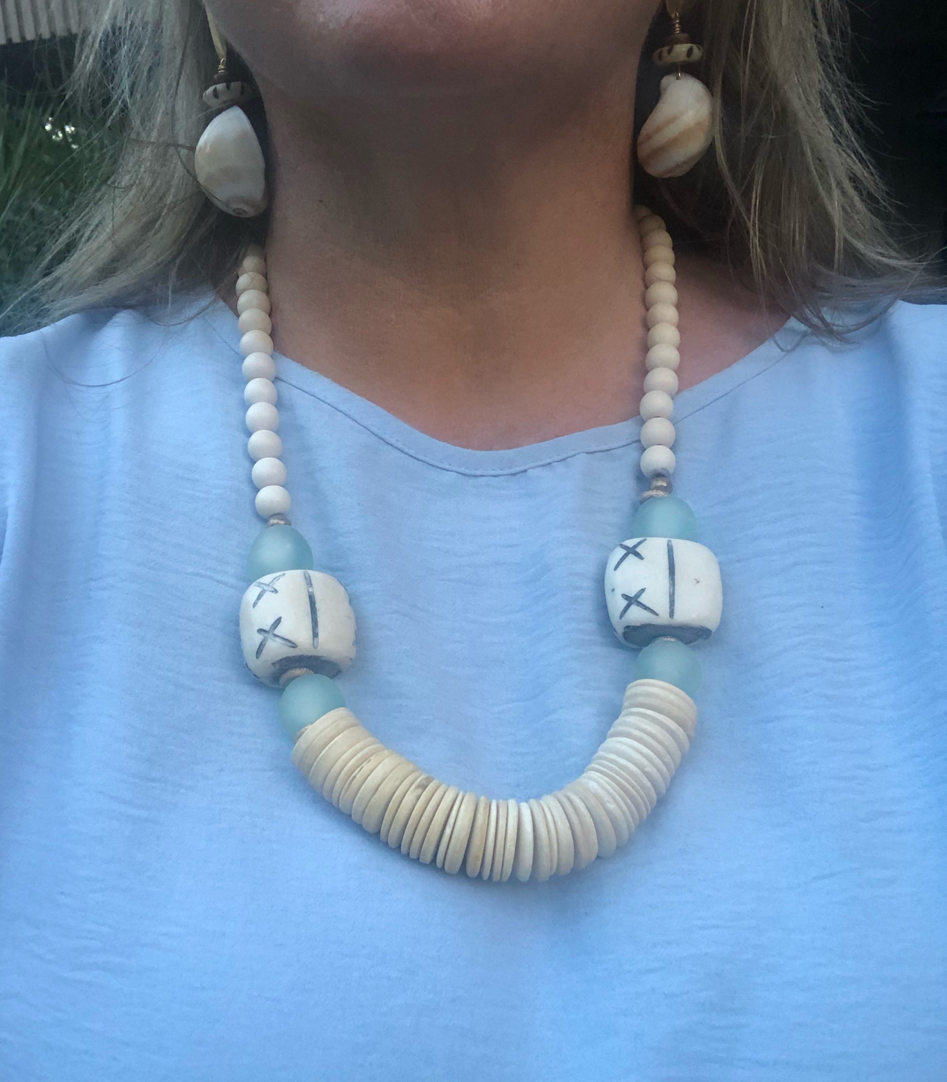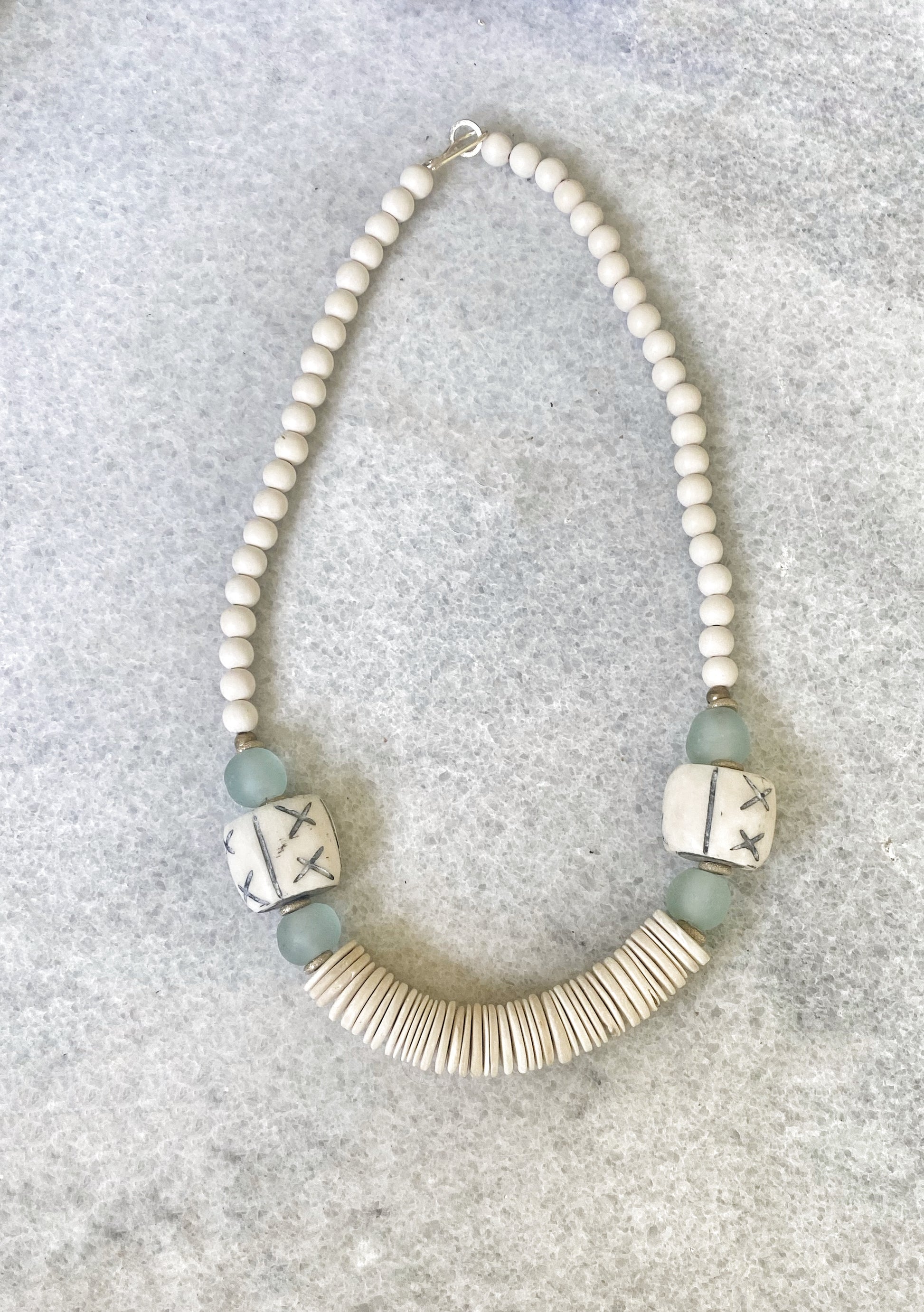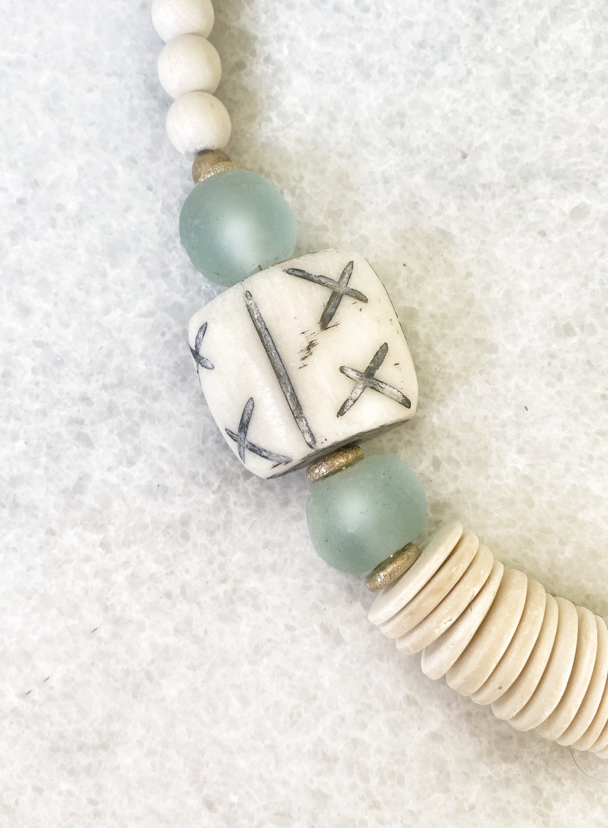Coconut discs have been paired with two striking large bone beads that have been hand-carved and polished by artisans in Kenya. The beautiful clear aqua recycled glass beads are handcrafted in Ghana making the necklace perfect for your beach vacation. A pop of brass finishes the look with brass beads handcrafted in Ethiopia. The bone, brass and recycled glass beads are all purchased fair trade.