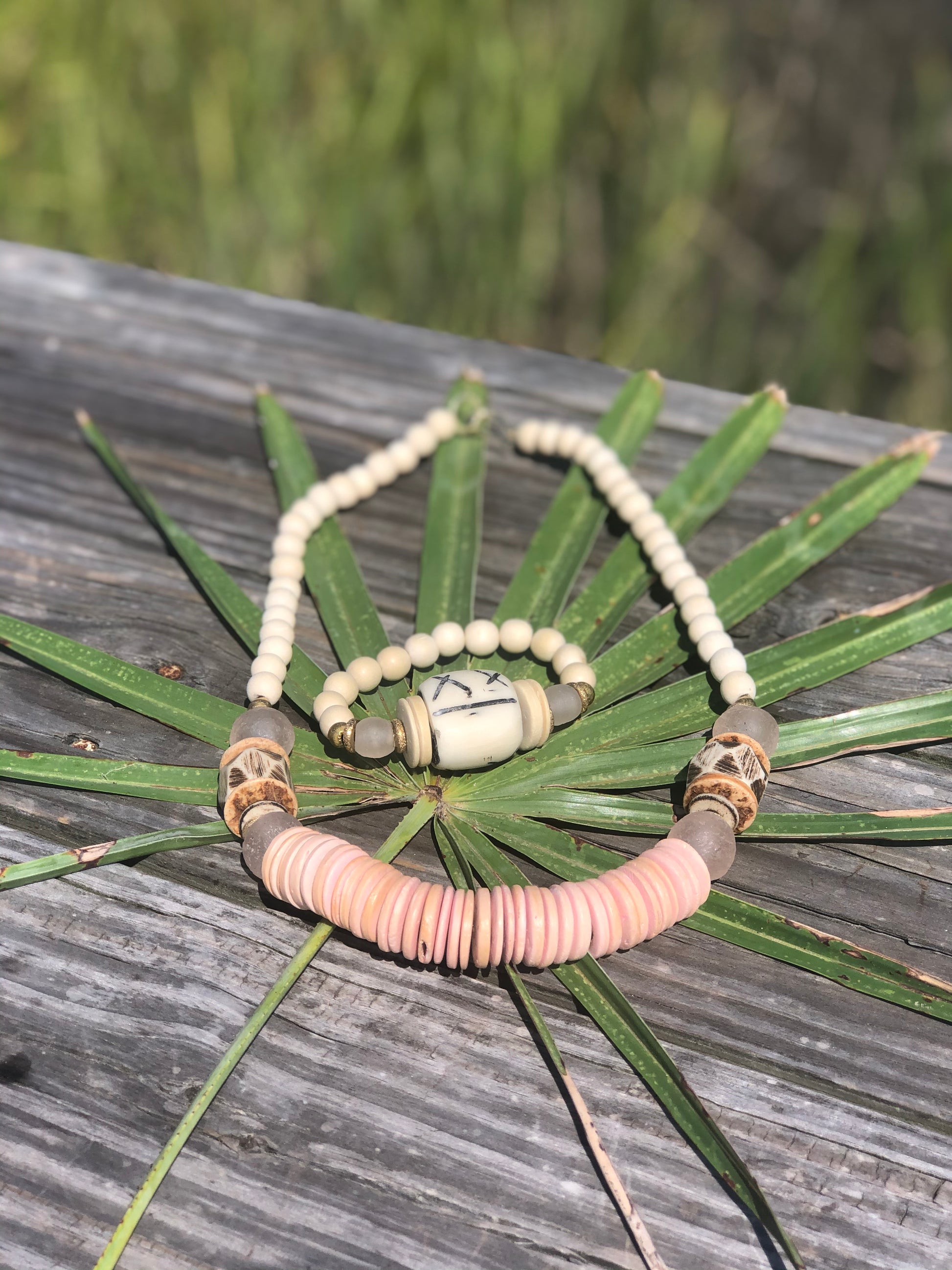 This bracelet comes in several colors and is available in separate listings. The one shown here has a very light blush recycled glass beads and pink coconut discs.