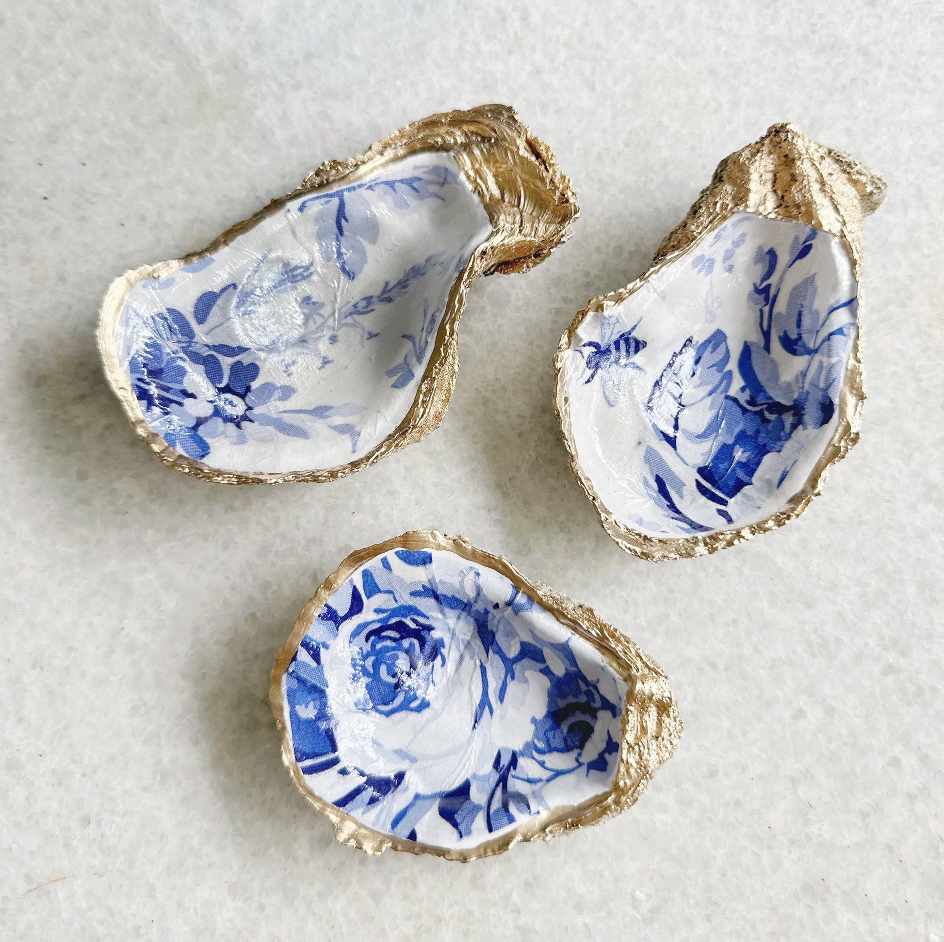 The oyster has a beautiful blue and white print. Oysters are hand-selected, cleaned and prepped with a glossy coat and gold-gilded rim. They may have natural imperfections.