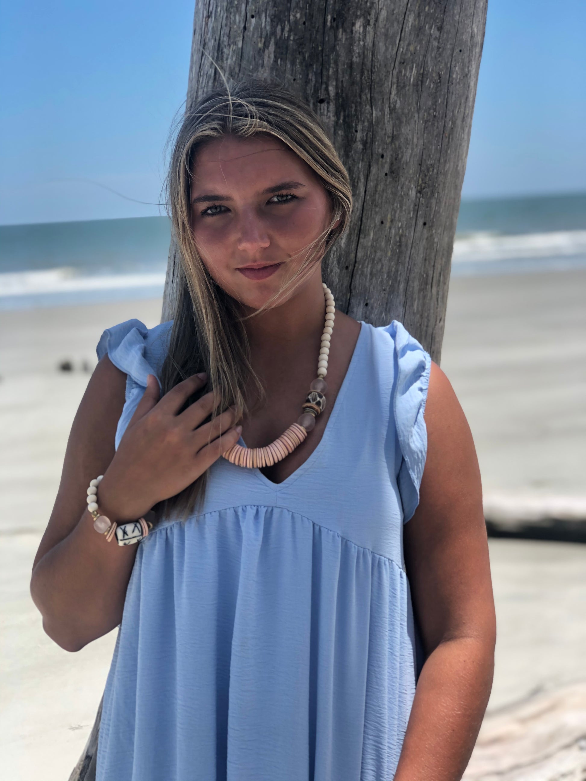 Pink coconut discs have been paired with two faceted rustic bone beads that have been hand-carved and polished by artisans in Kenya. The beautiful pale pink recycled glass beads are handcrafted in Ghana and the flat white rustic bone beads are from Nepal. A pop of brass finishes the look with brass beads handcrafted in Ethiopia. The bone, brass and recycled glass beads are all purchased fair trade.