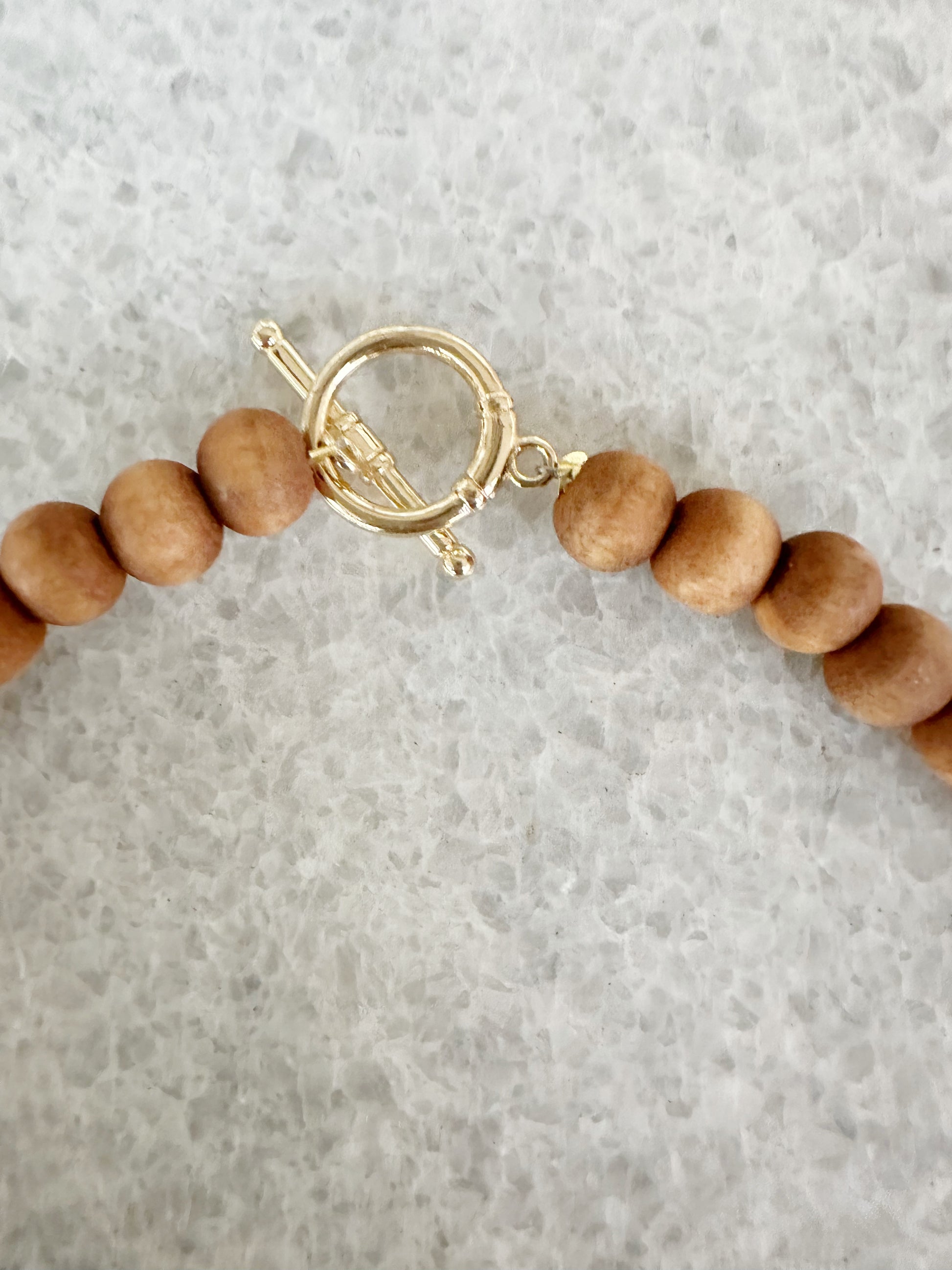 This striking necklace combines the rich textures of teal recycled glass beads, brass and hand-stained wood beads, creating a beautiful fusion of color and craftsmanship. The focal point is a handmade brass bead, crafted using the traditional lost wax method in Ghana, adding a unique, artisanal touch. Both the African glass and brass beads are purchased fair trade, ensuring a piece that’s as ethical as it is stunning.